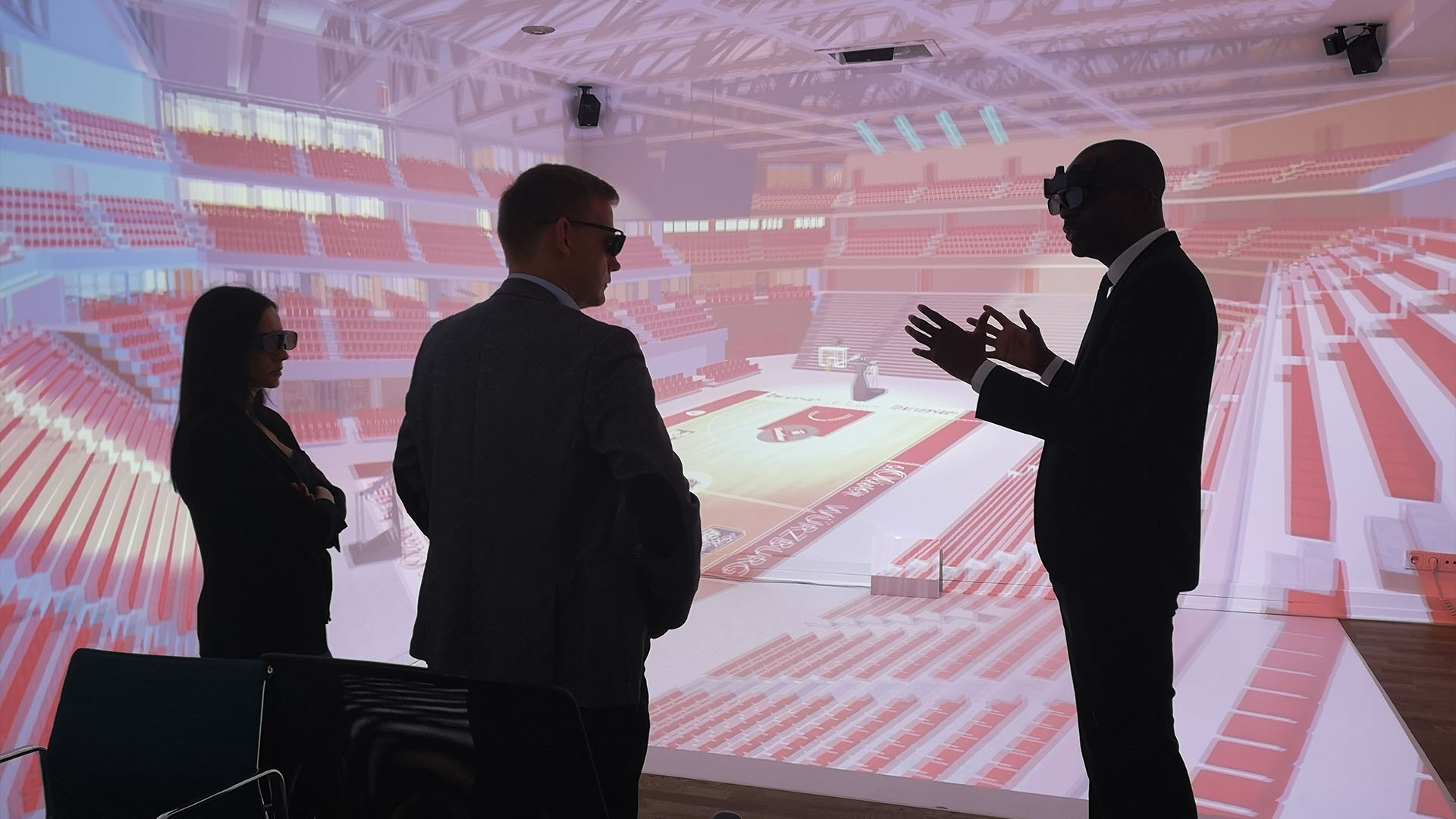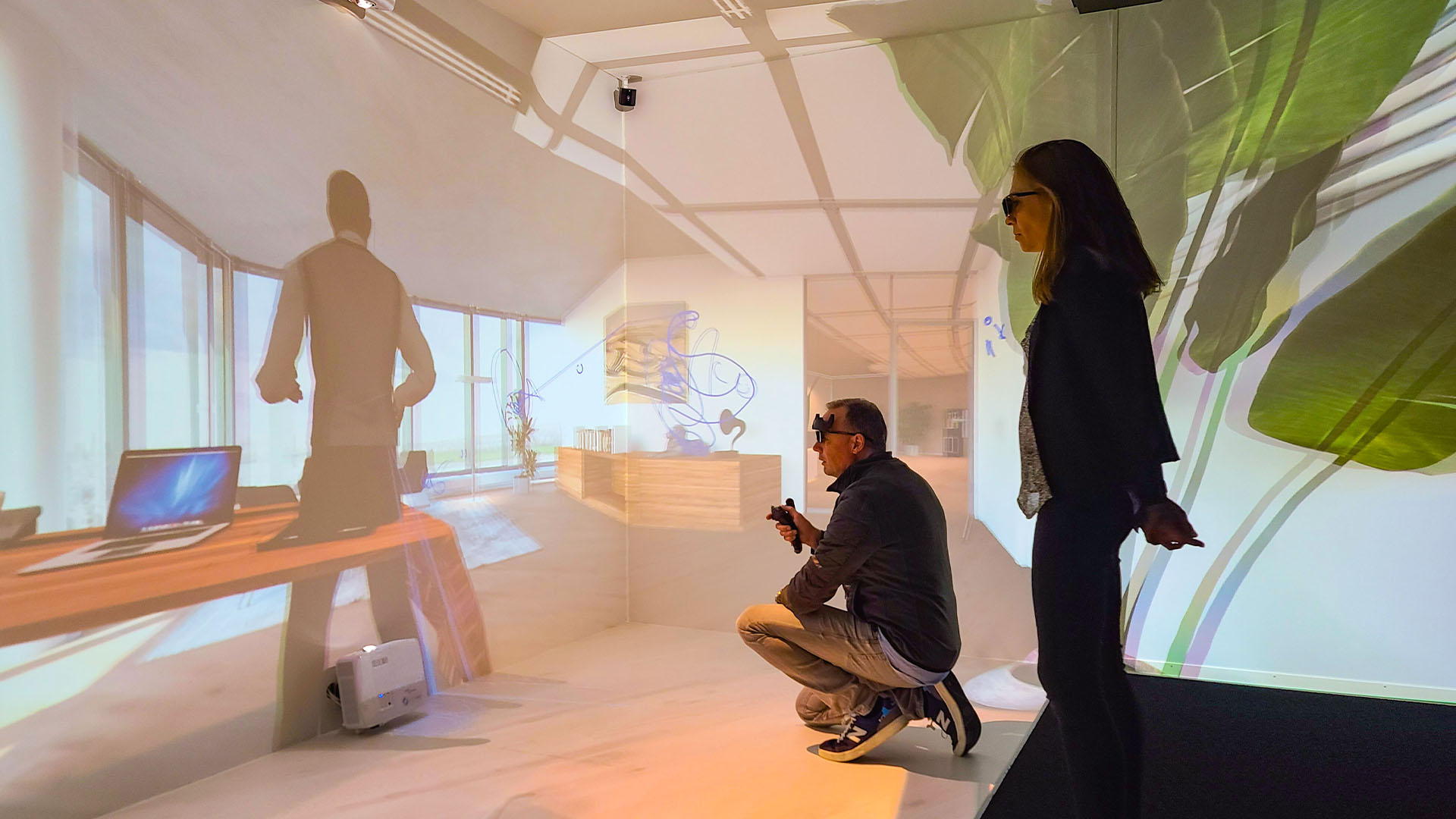 Mehrere Personen erleben SmartCave gleichzeitig im selben Raum. Direkte Kommunikation, natürlicher Blickkontakt, echte Kollaboration – Remote-Teilnehmer als Avatare zugeschaltet.