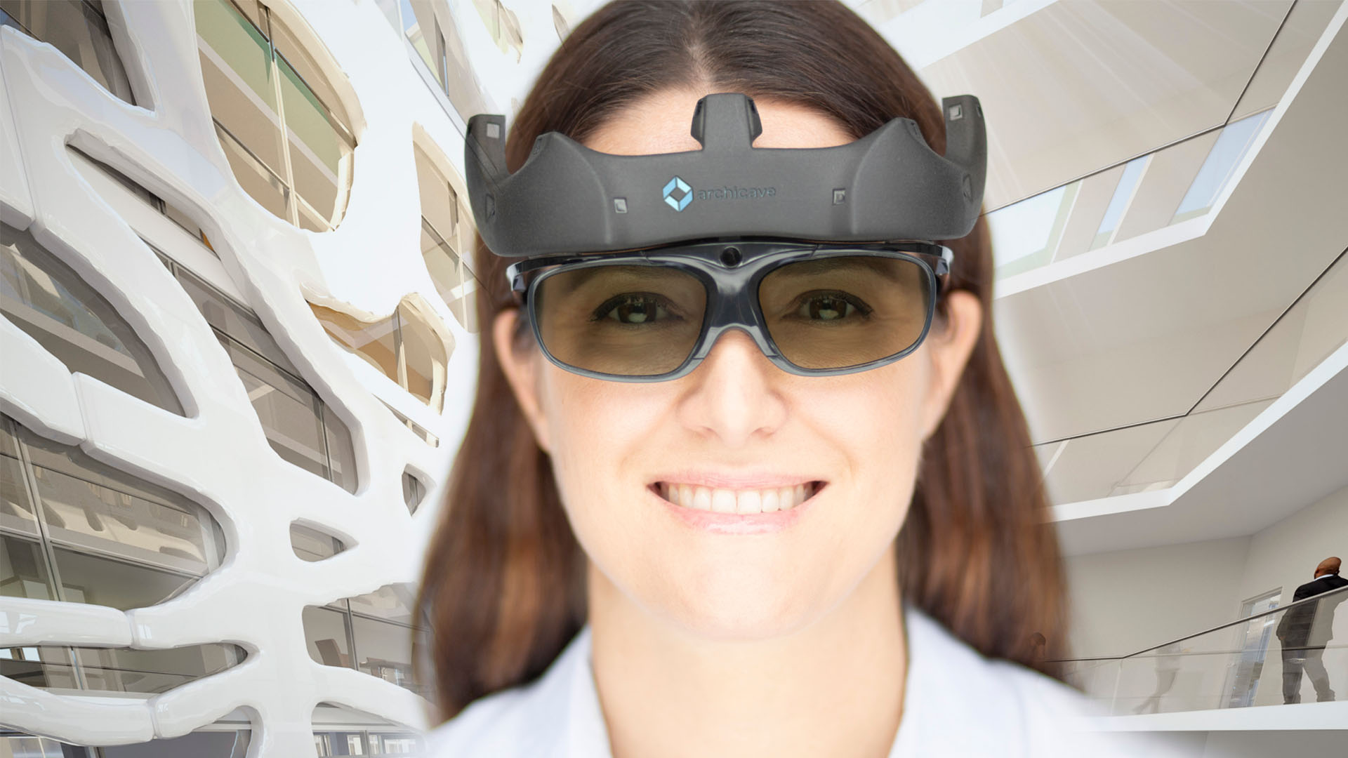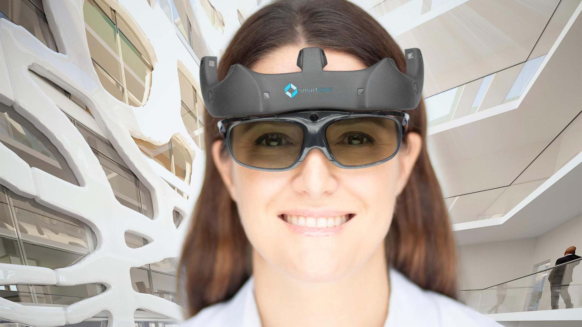 Eine leichte 3D-Brille mit Trackern statt eines geschlossenen Headsets. Sie sehen sich selbst, Ihren Körper, Ihre Umgebung – und alle Menschen im Raum.
