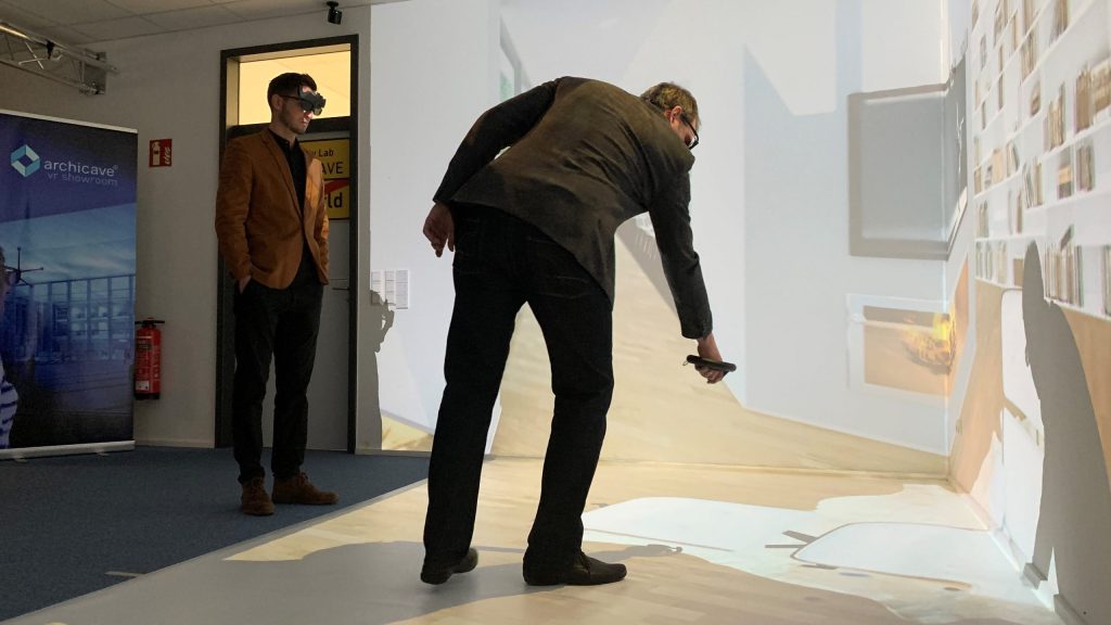 Besonders punkten konnte die VR-Cave mit ihren smarten Ausmaßen von etwa 4 m x 4 m x 3 m sowie der intensiven Immersion. Diese wird besonders unterstützt durch die innovative ArchiCave-Brille. Diese VR-Brille ist die erste durchsichtige VR-Brille und ermöglicht eine direkte Kommunikation. So können sich ganze Teams gleichzeitig in der VR-Szenerie aufhalten und gemeinsam einen Blick in die Zukunft ihres Projektes werfen. Eine Impression davon gibt es unter diesem LINK.