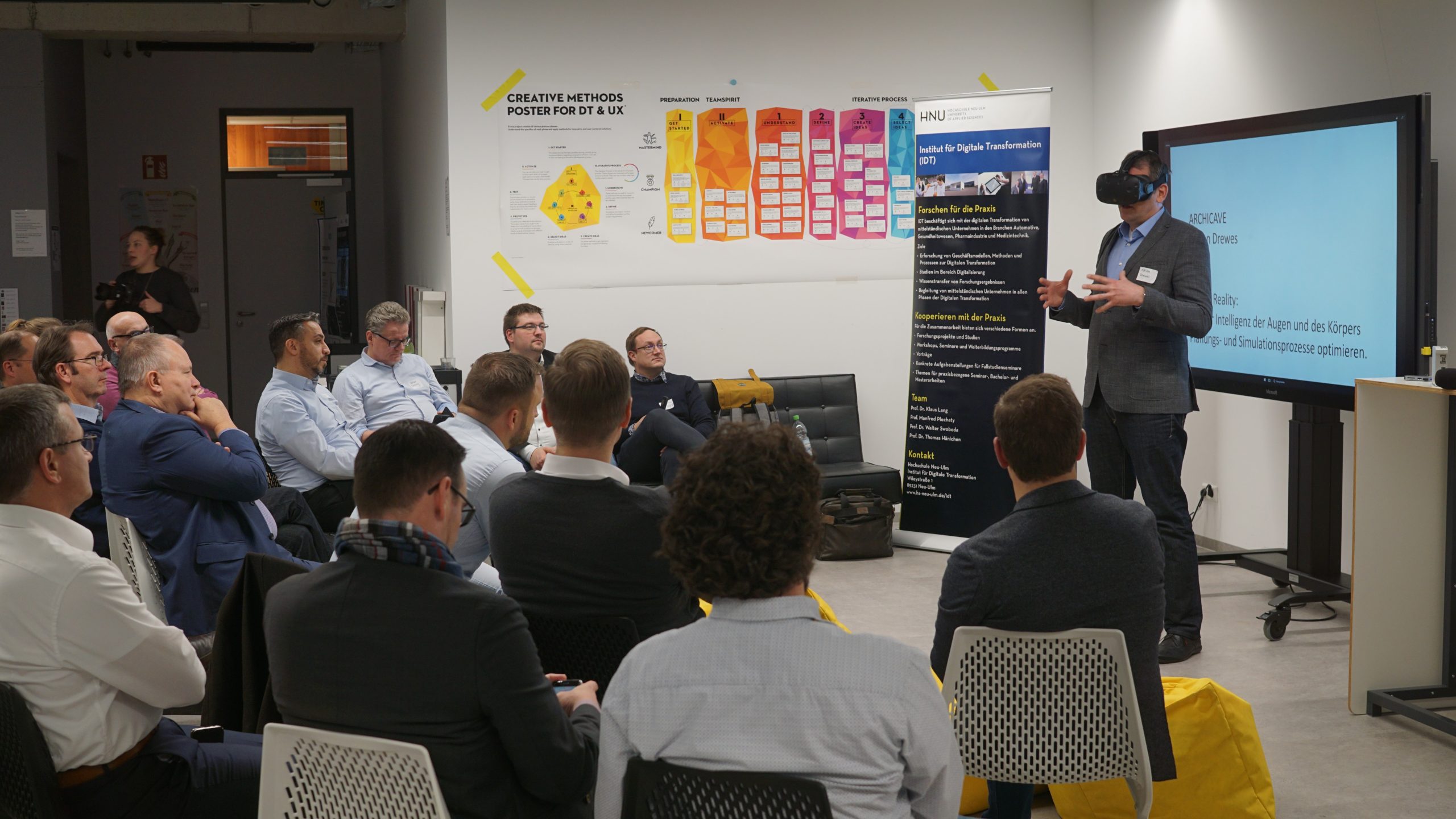 ArchiCave war zu Gast am Institut für digitale Transformation der Hochschule für angewandte Wissenschaften Neu-Ulm. Die neuartige VR-Cave wurde einem Publikum von Entscheidern der mittelständischen Wirtschaft und hochrangigen Vertretern der Wissenschaft präsentiert.